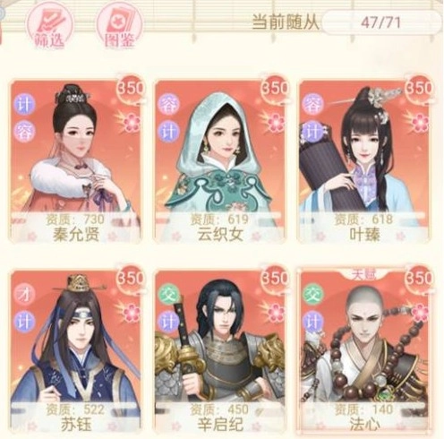 后宫宛如传中随从的培养方法如下: 1. 利用卷轴进行培养时,心计卷轴建议集中分配给单个随从。同时,积攒大总管资源用于跨服随从的单独培养,资质丸子也优先供给跨服随从,这样能更快提升势力值。另外,要积攒针线材料来升阶套装,建议完成一套套装的升阶后再进行下一套。还可以通过提升蓝颜亲密度、增加猫势力以及结亲等方式来换取势力值。