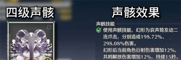 2、在2级和4级时,建议选择的声骸是哀声鸟,它不仅能提升衍射与大招的伤害,还能和主角的技能形成默契的搭配。