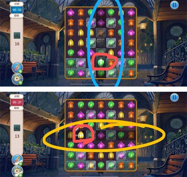 先消除任意颜色且数量≥6的灯后,会随机生成一个横向或竖向的特殊灯泡。消除带有特殊灯泡的灯(需满足≥3个)时,最后一个连接的灯将决定消除哪一行或哪一列;若存在两个相同颜色的特殊灯泡(一个横向、一个竖向),则会呈十字形消除。