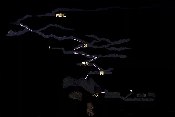 用锄头清理出一条通路后,前方又遇到了一个无法攀爬的高台。之前在那个紫绿蘑菇共生的蘑菇洞里观察到,只要找块空地让这两种蘑菇相邻种植,就能长出一朵大蘑菇。
