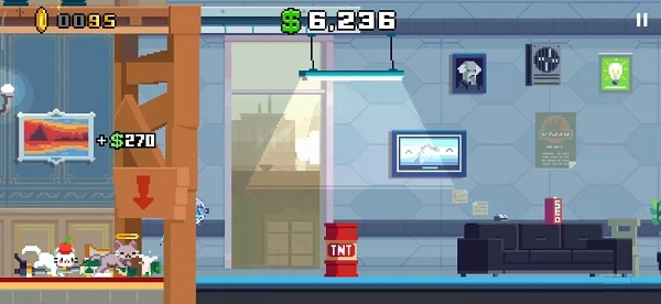 4、计分方式为跑酷距离与破坏损失的乘积;游戏采用像素风格的画面,搭配轻松的背景音乐。