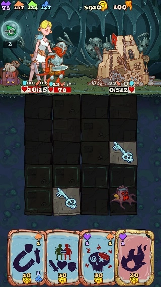 你可以从四个基础角色里挑选一个英雄,去挑战地牢里的最终Boss。这个角色会在地下冒险时运用自己的一副牌,而且每个角色都拥有专属的特殊卡牌和技能。