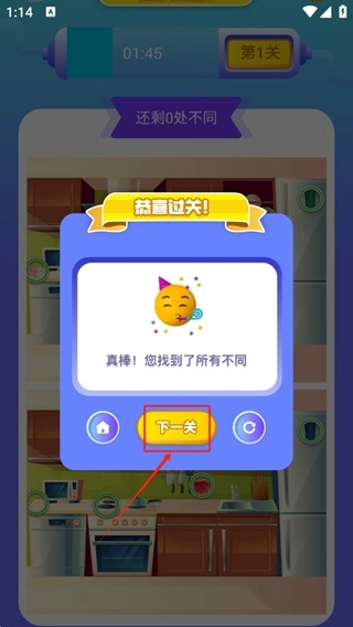 4. 持续挑战:成功通过当前关卡后,点击“下一关”按钮,就能继续您的找茬探索之旅。