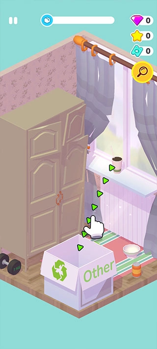 1、进入家居人生,滑动将旧物品装进打包盒里。