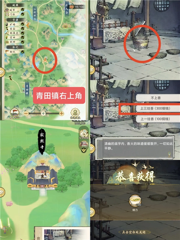 5、青田镇右上角,花费300铜钱上三炷香,获得20精力。
