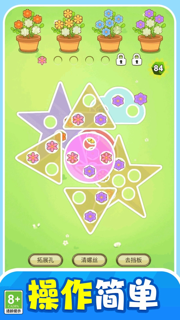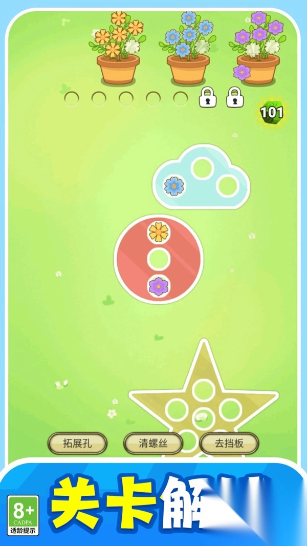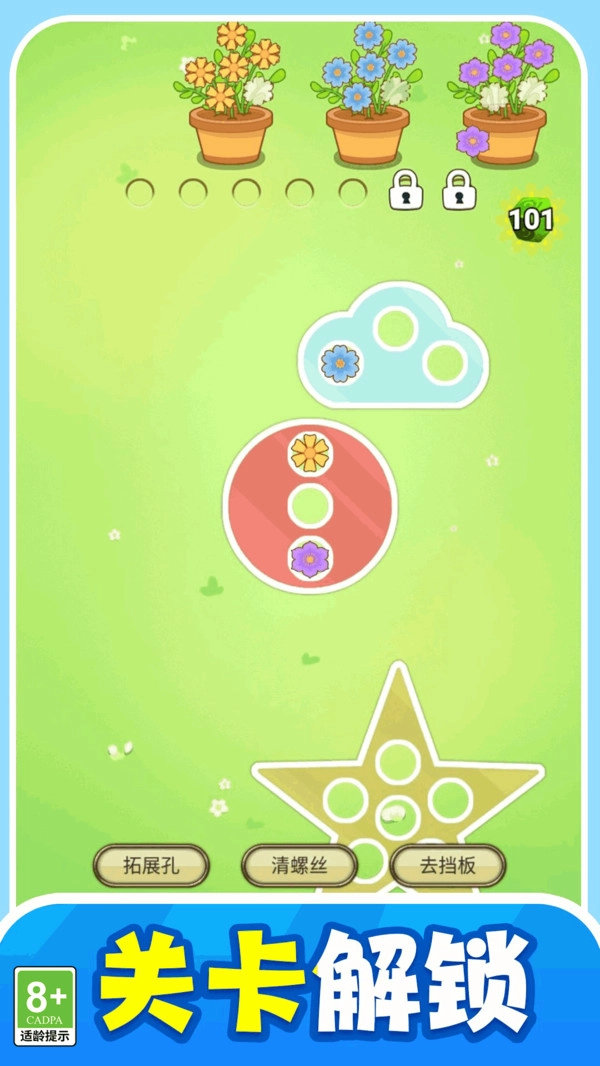 2、遇到棘手的关卡时,游戏提供了多种实用道具:拓展孔能拓宽你的操作范围,清螺丝道具则可助你快速清除障碍。