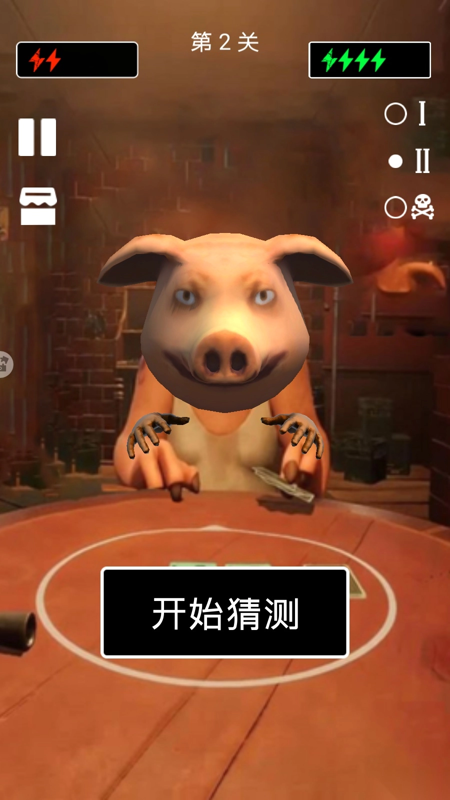 《末日战场生死局》是一款操作简单的对决类游戏,进入游戏界面后,会出现一个猪头怪物,玩家需要与这个怪物展开对决。游戏的核心玩法是通过猜测屏幕中猪头形象代表的是自己还是怪物来判定胜负:如果猜对了,就能对怪物发起一次攻击;要是猜错了,则会被怪物攻击一次。玩家和怪物各自拥有6次生命值机会,率先将对方的生命值清空的一方即可获得胜利。游戏包含非常丰富的关卡,玩家可以从第一关开始挑战,每胜利一关就能解锁下一关,依次进入第二关、第三关……每个关卡的玩法保持一致,玩家需要判断屏幕上的猪头形象对应的是自己还是怪物,每次猜测后会立即得到结果,并且会有左轮枪攻击猜错的一方。感兴趣的朋友可以尝试体验哦。