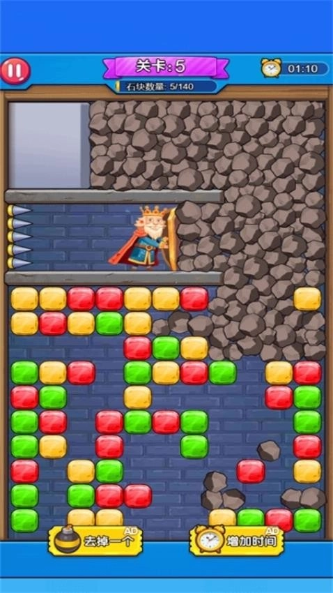 1、玩家要持续移动宝石并进行消除,最终开辟出一个出口,让碎石能从这个出口掉落,国王就能脱离危险了。