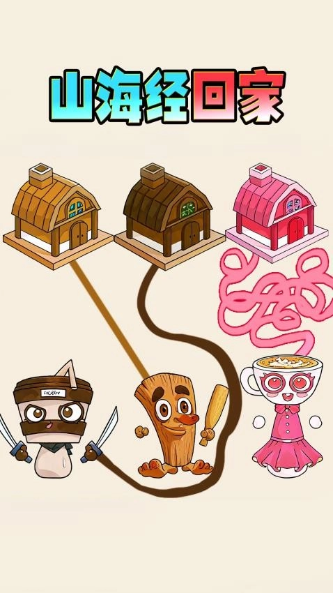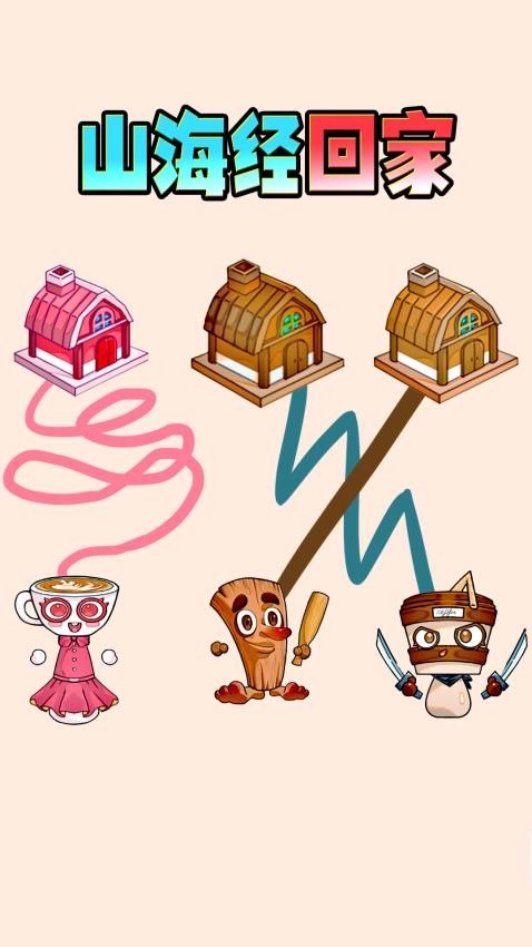1、疯狂画线大师的画面如图所示,能展示四种图形的连接方式,需把房子和下方的角色连接起来,只要找到正确的颜色就能开始连接