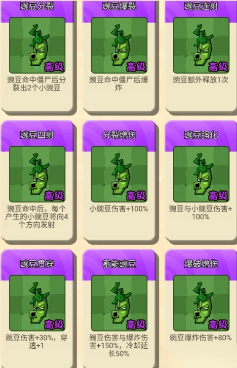 豌豆分裂:豌豆击中僵尸后会分裂出2颗小豌豆;豌豆爆裂:豌豆击中僵尸后会发生爆炸