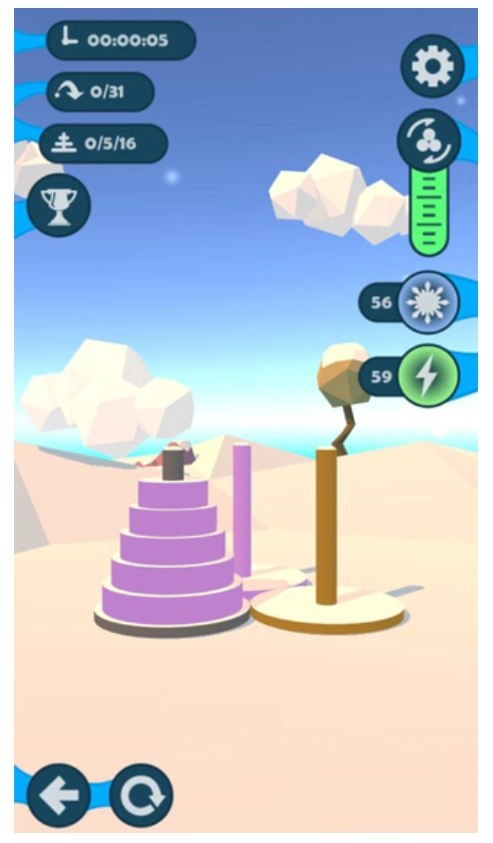1、玩法是大家熟悉的汉诺塔,这是源自印度古老传说的益智玩具,传说中一根柱子上从下到上按大小顺序摞着64片黄金圆盘,看似简单的玩法,实际体验起来却十分烧脑又刺激。