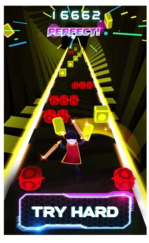 2、在富有节奏感的音乐中,长按屏幕操控左右移动的小人,用小人手中的光剑斩断迎面飞来的方块!记得要避开所有障碍物哦~