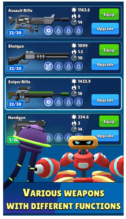 3、游戏拥有令人惊叹的视觉效果与丰富多彩的图形,提供多种武器类型供玩家获取,每种武器都具备专属功能与便捷的操作体验。玩家的核心任务是击败敌人,迅速推进任务进程,从而获取更多丰厚奖励。