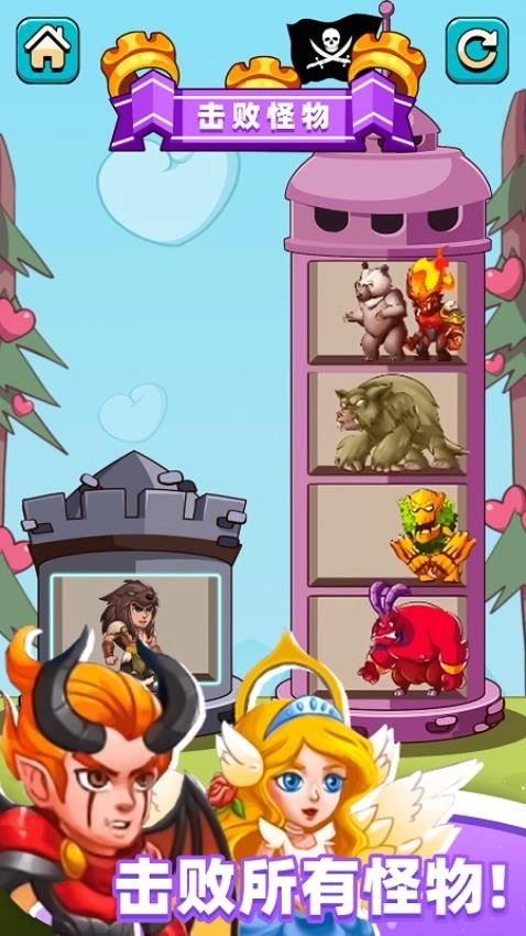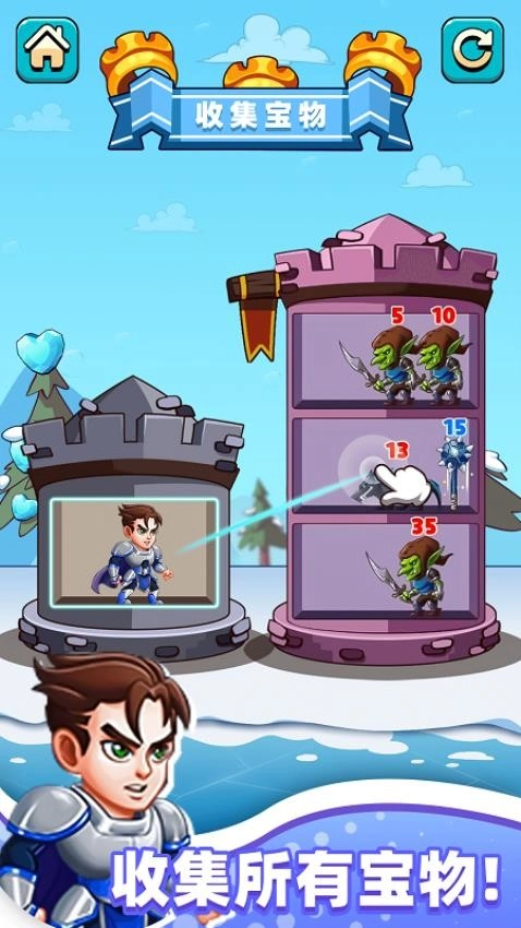 2、玩家在游戏中化身为王子,需击溃眼前一波又一波怪物方可营救公主。前期得先挑战实力较弱的敌人,通过逐步闯关、战胜所有对手,就能快速提升自身能力,进而不断爬塔升级。