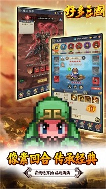 《好多三国》是一款以三国为背景打造的像素风格回合制游戏,在保留经典玩法系统的基础上,融入了创新的游戏机制。玩家将化身为一名渴望建功立业的小兵,从汉中之战启程,一路征战直至实现天下一统,书写专属于自己的小兵传奇。在这里,你可以收集并培养三国时期的众多知名武将,通过巧妙搭配阵容,既能选择挂机战斗轻松推进,也能主动挑战强大首领,体验丰富的战斗乐趣。