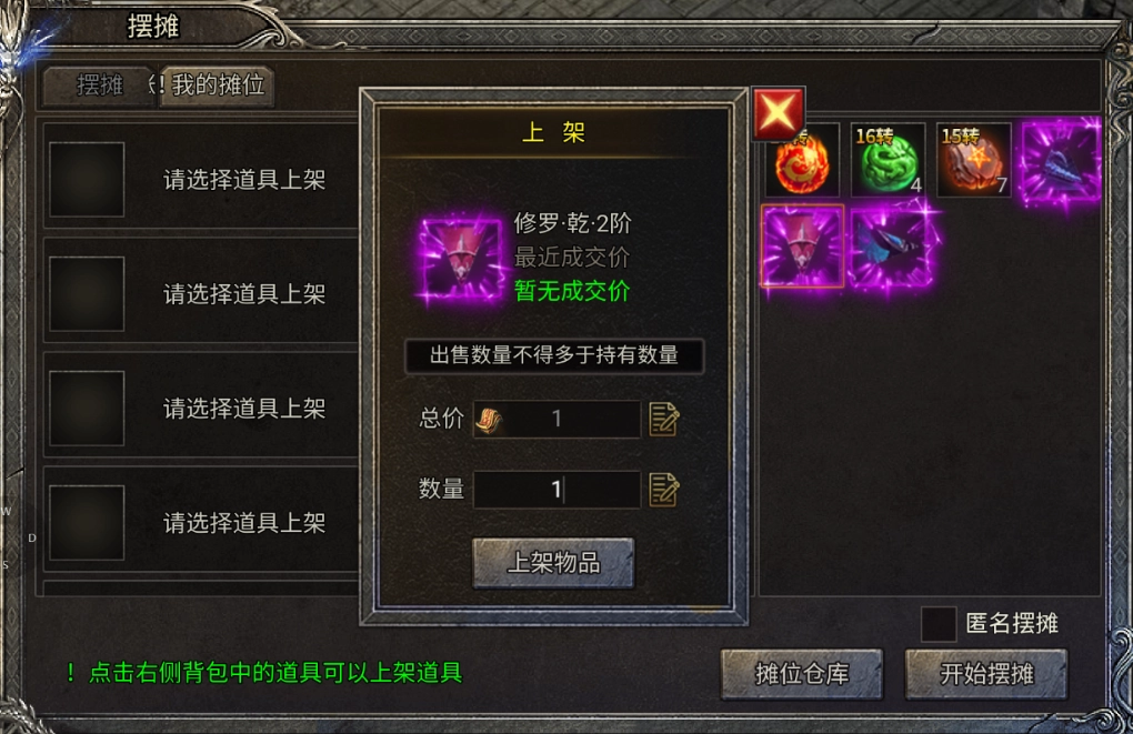 如果玩家打到了较多想要出售的装备或道具,游戏内设有摆摊系统,大家可以把不绑定的装备和道具放到摆摊系统上售卖。需要注意的是,摆摊的数量不能超过自己持有的数量。至于出售所需的灵符价格,玩家可以自行设置认为合适的价位,也可以参考上架时显示的成交价来设定合理价格后再上架。