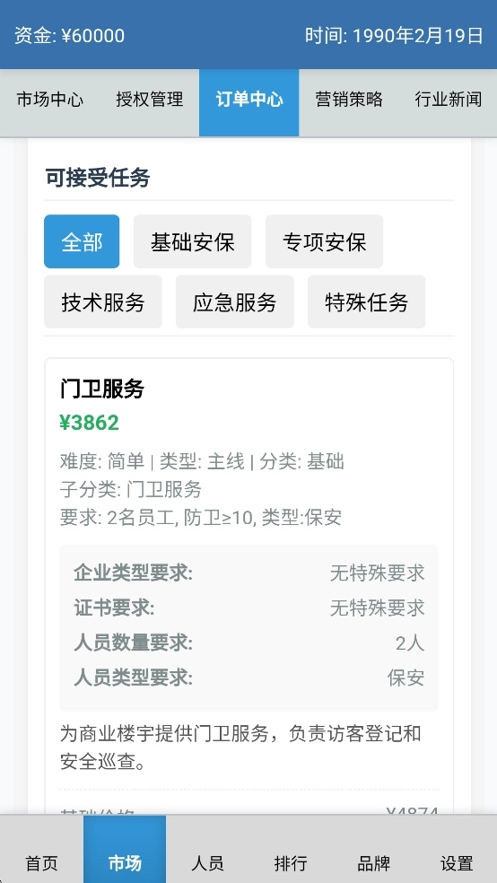 安保集团是一款以文字为核心的模拟经营游戏。在游戏里,玩家将负责经营一家安保公司。刚开始时,你只能接一些像小区巡逻、店铺安保这类小型业务订单。等赚到第一桶金后,就得着手招聘员工、购置基础装备,并且合理调配资源,保证公司能平稳运转。你还得满足各种要求去考取不同的专业证书,每拿到一个新证书,就代表着解锁了新的业务范畴,公司的口碑和市场竞争力也会跟着提高。当公司发展到一定规模,满足年营业额突破千万、持有多项国际证书、开设多家分公司等条件后,你就可以筹备建立跨国公司,体验在全球范围内布局业务、应对不同国家法规的终极挑战!