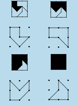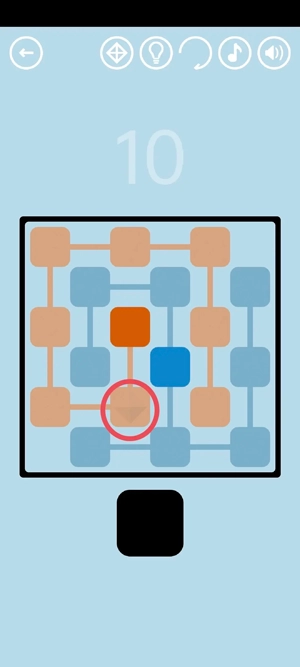 10、在第10关里,点击方块之间的空隙会出现连接线,点击连接线能让它改变方向。连接线可以把方块连接起来,和彩色方块相连的方块会变成彩色,让所有方块都变成彩色就能通关。其中一种通关方法如图所示。红宝石藏在随机一个黑色方块里,当这个方块变成彩色时,图中红圈标注的位置会显示出红宝石的轮廓,之后点击这个方块就能拿到红宝石。