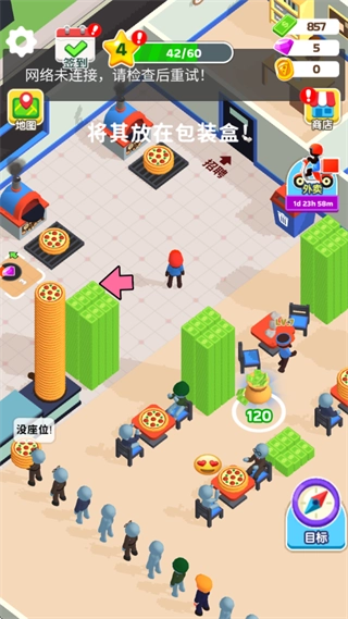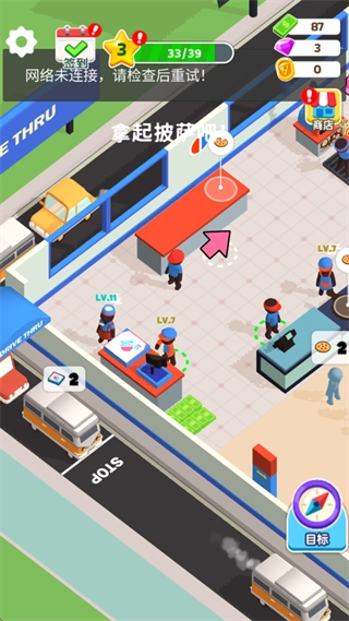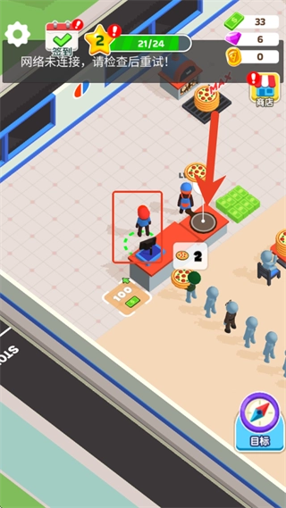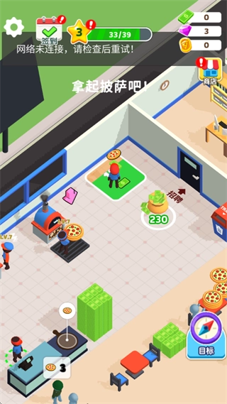 1、在游戏中我们要经营一家披萨店,通过滑动屏幕来控制小人移动,让它触碰场景里的各个区域进行互动,收集到足够多的钱后,踩在地面的特殊方块上就能解锁更多场景。
