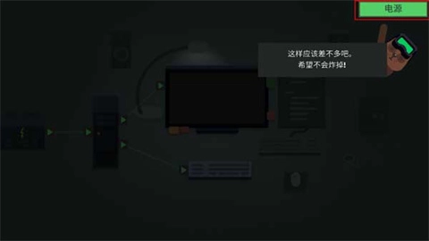 2、接下来会进入新手教程环节,第一步是接通电源。找到闪烁的三角形图标,点击并拖动它,把电源插座分别连接到电脑、显示器和键盘上,然后点击“电源”按钮就能启动电脑了。