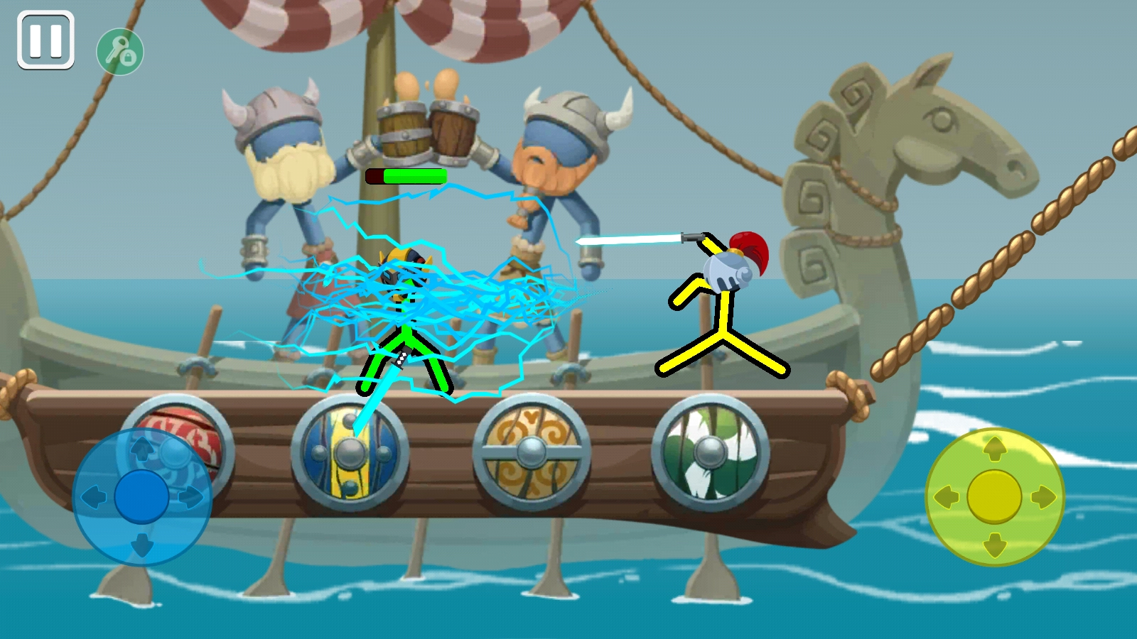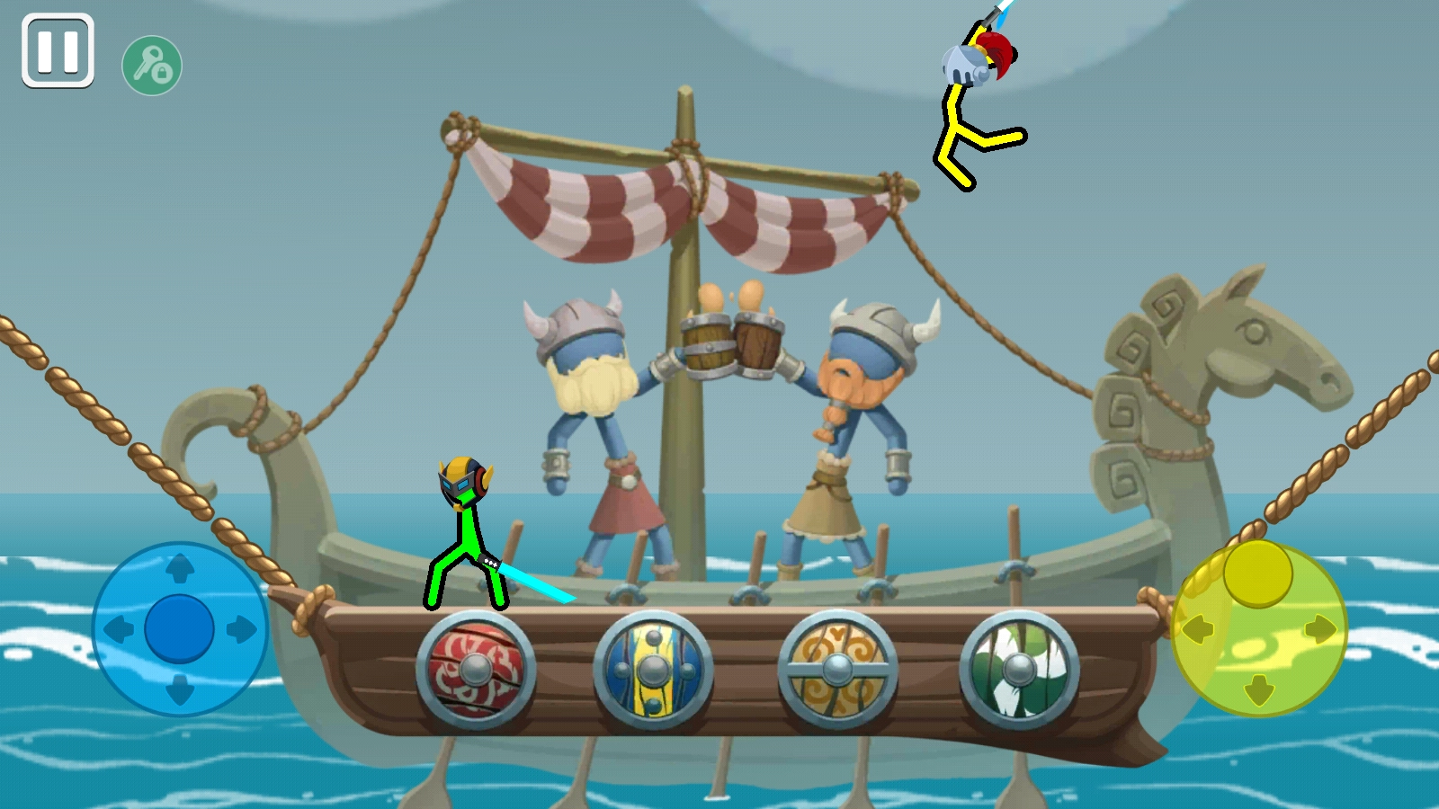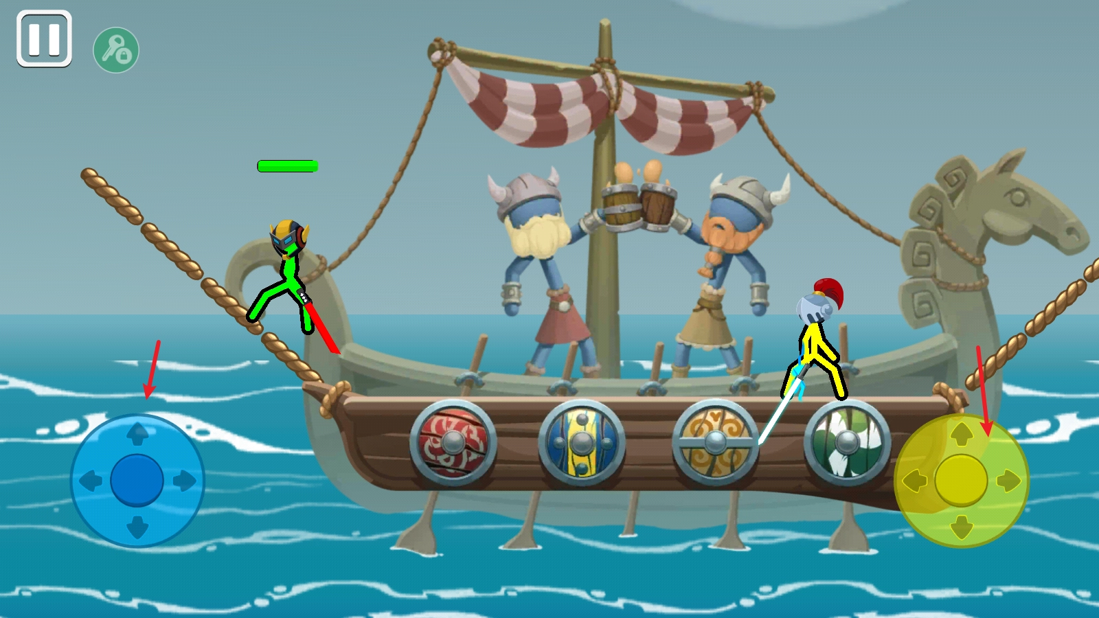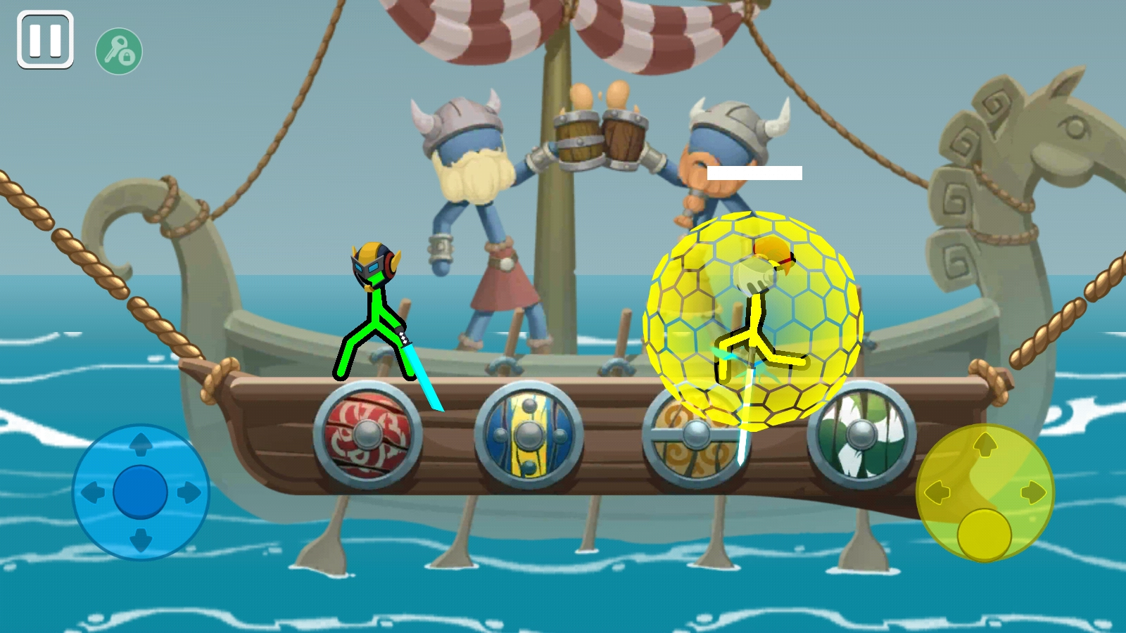 4、击败对手的方式是通过操控方向键(支持长按与短按操作),让武器命中对方,或是用腿部靠近对手进行近身攻击(攻击头部造成的伤害更大),直到对方的血条耗尽,或是把对方推落海里使其直接淘汰。