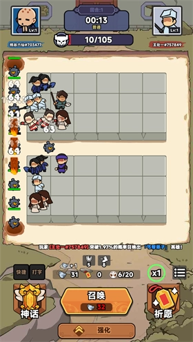 召唤是战斗里的核心功能之一,点击召唤按钮会消耗银两,随机召唤出普通、稀有、史诗、传说品质的武侠。每个格子最多能放三个相同的武侠,但神话品质的武侠每个格子只能放一位。每个玩家都有人口上限,每召唤一个武侠人口就加1,要是召唤数量达到人口上限,就算还有空格子也不能再召唤武侠了。人口上限可以通过获取或升级宝物来提高。