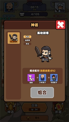 点击【神话】按钮即可查看神话武侠的组合条件,组合进度会显示在神话武侠的图标上。当进度达到100%后,点击该武侠的头像,再点击组合按钮,就能通过消耗组合条件中要求的武侠,召唤出强大的神话武侠。
