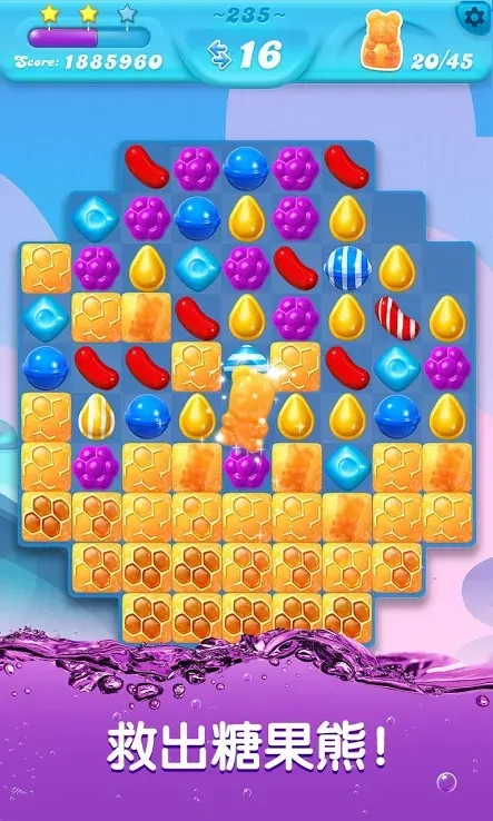 2、蜂蜜模式:该模式的目标是解救被蜂蜜困住的糖果熊。只要在蜂蜜附近进行消除操作,就能成功解救糖果熊。每个空格所显示的蜂窝数量,代表着完全消除该位置蜂蜜所需的消除次数。