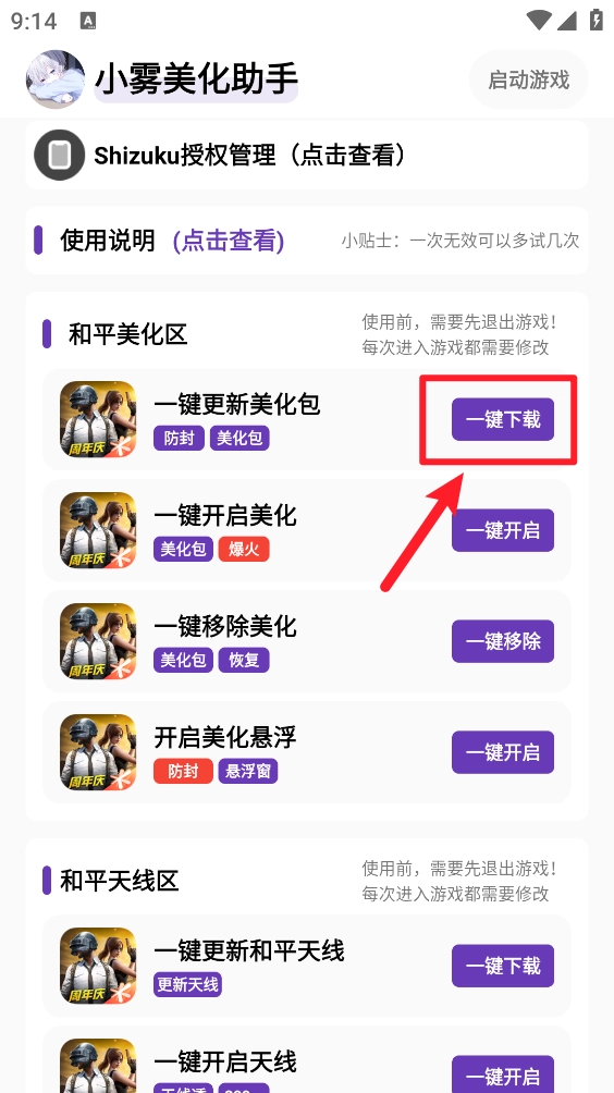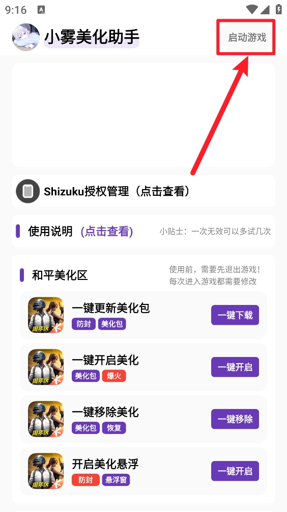 小贴士:若启动时出现需更新资源的情况,可按以下步骤操作防止意外闪退并完成美化:先移除美化,进入游戏到登录界面后退出;再回到“小雾美化助手”开启美化,重新进入游戏即可。