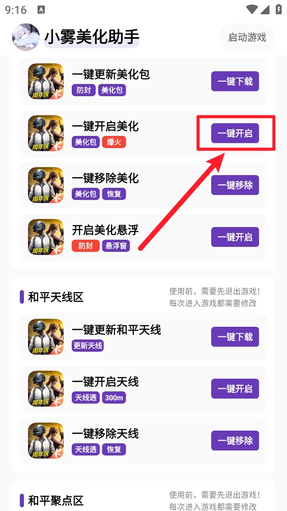 5、打开小雾美化助手,点击“一键开启美化”,就能完成美化操作。