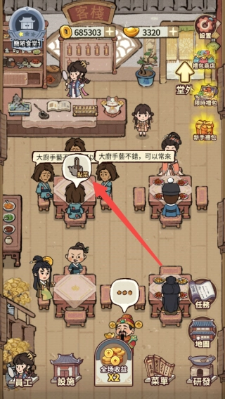 3、玩家在经营过程中需要招募各类员工,让他们为客栈提供专业服务,以此提升顾客的满意度。这些员工角色各有特点,不同的搭配组合会带来不一样的效果。