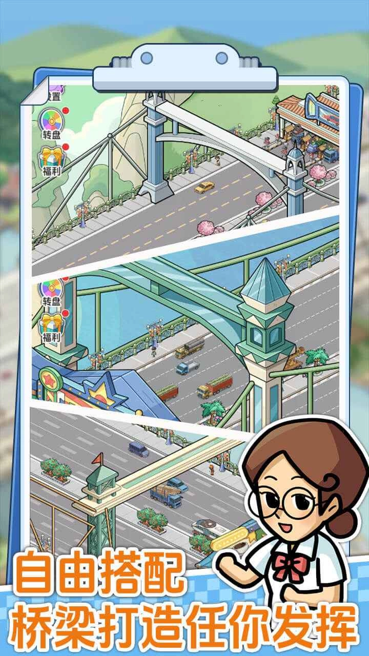 桥梁大亨是一款放置类的休闲经营游戏。玩家扮演桥梁公司的老板,需要建造一座座桥梁,按照提示操作即可完成建造。之后可以招聘清洁工、巡查员等不同职责的员工来管理桥梁,每当有车辆经过桥梁就能获取收益,借助这些收益可以轻松升级公司,进而寻找更合适的地点建造新的桥梁。
