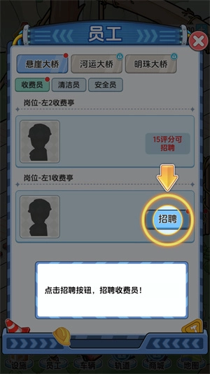 1、先点击最下方的员工图标,要记得招募一名收费员。