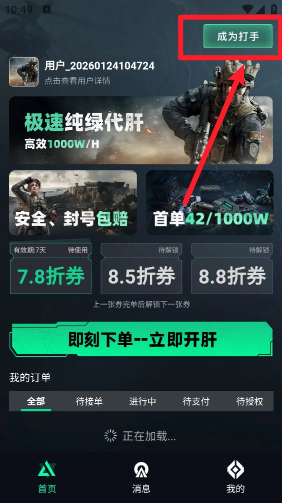 2、如图所示,点击右上角的“成为打手”按钮,即可完成成为打手的操作。