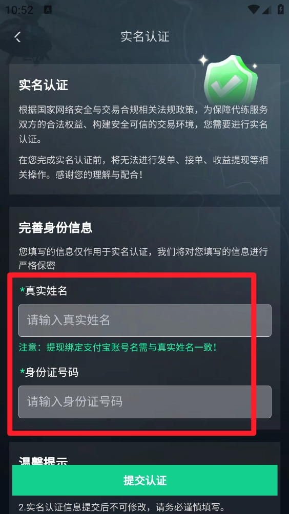 3、最后输入实名信息,点击底部"提交认证"即可。