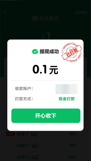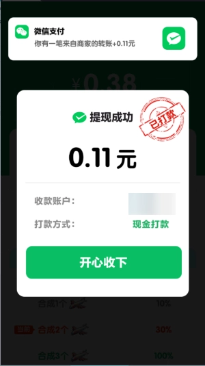5、成功合成飞机后,系统会给予一次提现机会,此时可直接发起提现操作,本次提现到账金额为0.11。