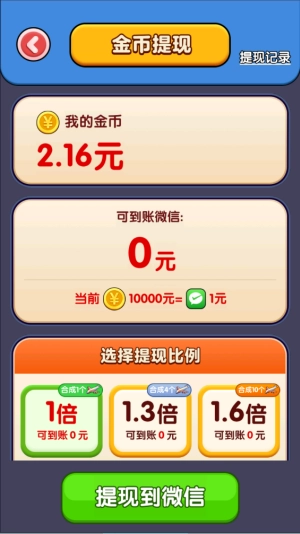 3、过程中还能获得金币奖励,金币可按万分之一的比例兑换提现,而且合成的飞机数量越多,提现比例就越高。