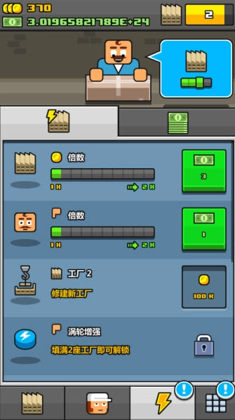 4、点击闪电按钮可以升级当前工厂的各种功能。