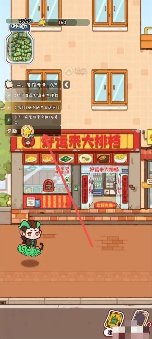 1、打开烟火食记,在里面开一家大排档,完成大排档建设后点击领取奖励。