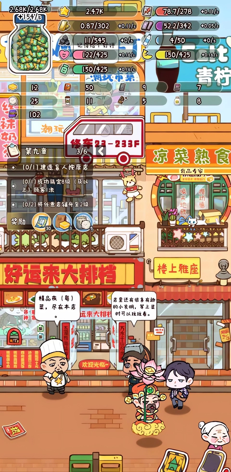 这款游戏的画风十分可爱,角色与建筑都设计得颇具特色;模拟真实烹饪的玩法趣味十足,还有大量菜谱可供收集。不过它也存在一些不足:新手引导需要进一步完善,员工的标签和装备系统稍显复杂,部分装饰物的繁荣度与其占用空间不太匹配。整体而言,其基建玩法与手账式烹饪很有吸引力,能让人产生成为商业街大亨的代入感;各章节间的剧情设计也很精彩。但到了后期,资源限制确实会影响游戏进程,希望能对资源获取机制或时间进行优化。总的来说,如果你喜欢模拟经营类游戏,这款还是非常值得尝试的。