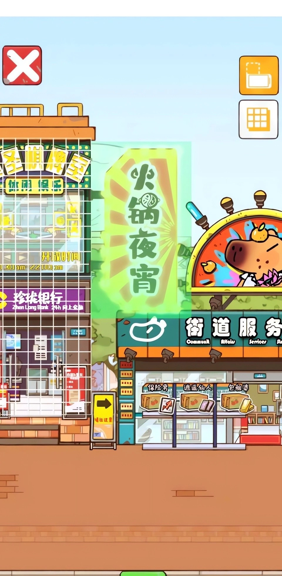 界面呈现出卡通漫画般的风格,街道上的角色均采用Q版造型,与色彩缤纷的建筑及装饰相互映衬,整体氛围充满活力。游戏采用2D界面设计,商业街长度较长,需通过左右滑动来展示更多街景内容。