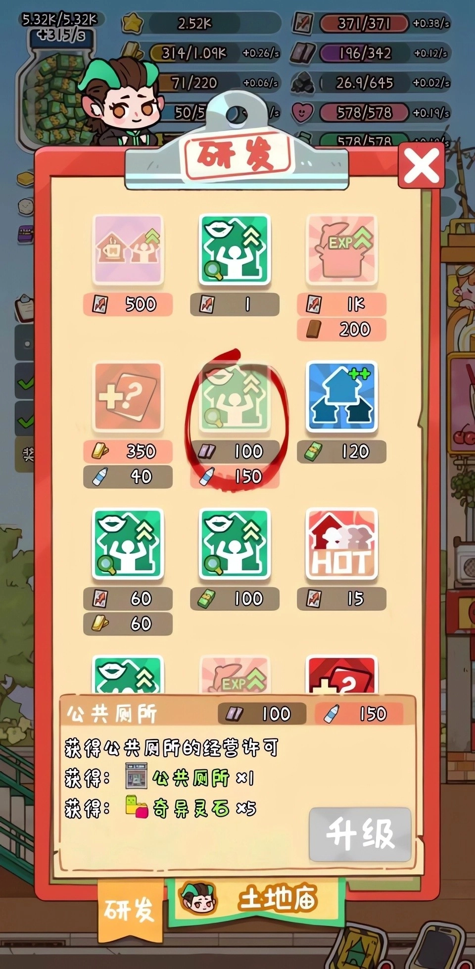 4、升级道具可以提升店铺的单次收益,而且每个道具的属性都各不相同。