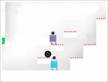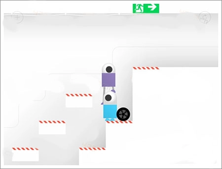 两个机器人都借助轮胎向上攀爬,最后,先让紫色机器人踩在蓝色机器人的头顶,接着爬上轮胎,成功通过了关卡。