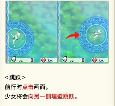 1、跳跃:向前移动时点击屏幕,少女就会朝着对面的墙壁跳跃。