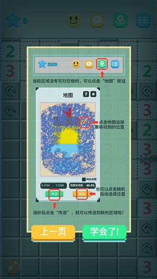 4、点击第三个图标后,我们能看到扫雷地图的完整全貌。要是你想玩扫雷,只需点击“随机”按钮,再点击“传送”,就能被传送到其他人尚未扫过的区域,然后就可以开始扫雷了。