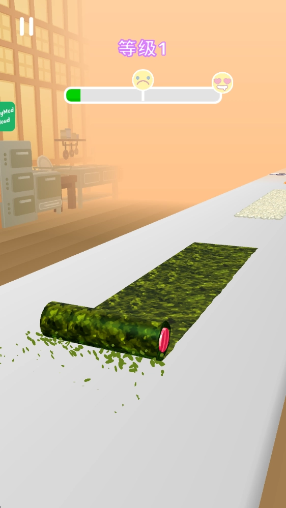 2、第一关就是制作寿司,按住屏幕即可控制滚动。