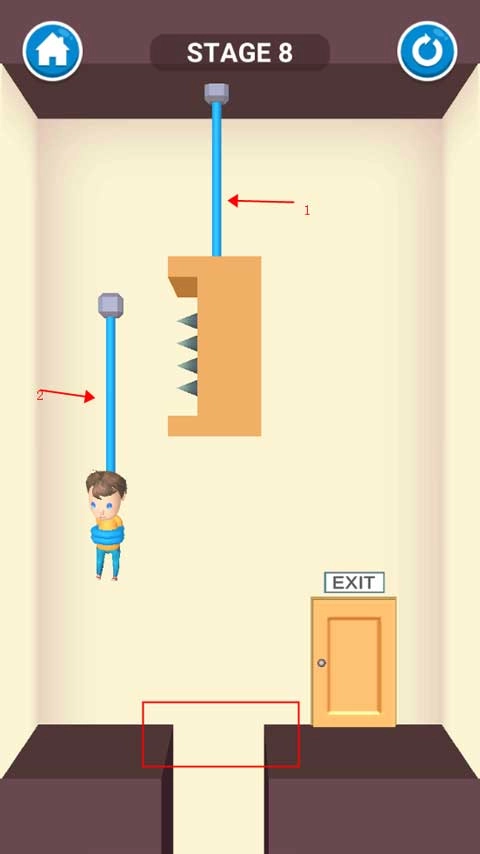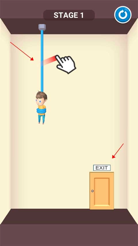 这一关很简单,只需用手指划过悬挂着小男孩的绳子,小男孩获救后就会自行走向出口,这样就能通过关卡了。