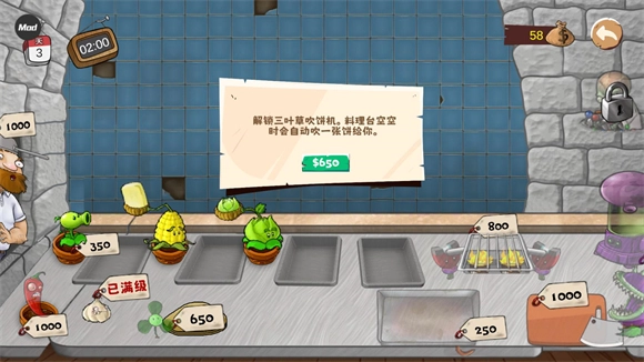 解锁三叶草后,可先选择升级大蒜,接着升级机枪和戴夫,之后在烤阳光菇与辣椒酱中任选其一,这样能帮助你完成更多订单。