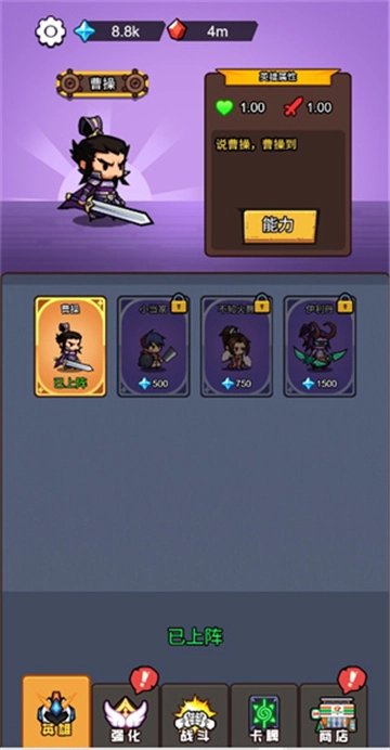 7、在英雄界面,可通过解锁英雄来进行上阵替换和能力查看操作。