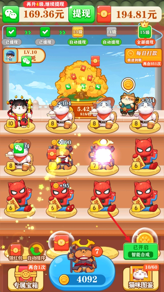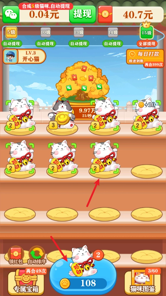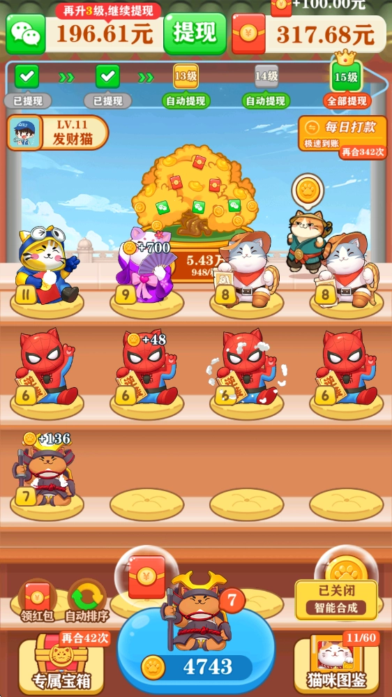 2、每一次合成都是充满惊喜的体验,通过简单的合成操作不断解锁更高级别的猫咪,还能收获丰厚的奖励。
